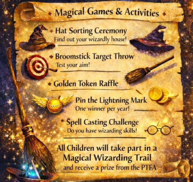 All children will also take part in the Magical Wizarding Trail and recieve a prize from the PTFA!